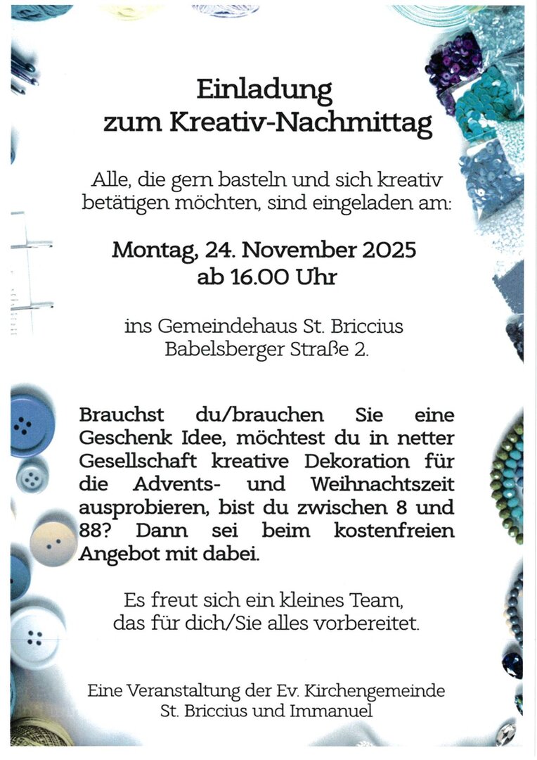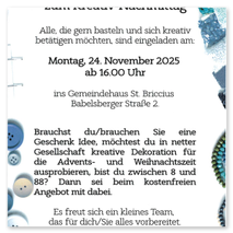 Herzliche Einladung zur FriedensDekade 2025 - Wochentagsandachten: Montag, 10.11.25 bis Freitag, 14.11.2025 und Montag, 17.11.2025 und Dienstag, 18.11.2025 jeweils um 18.00 Uhr in der St. Briccius-Kirche. Die Andachten werden von verschiedenen Gruppen und Kreisen unserer Gemeinde gestaltet.